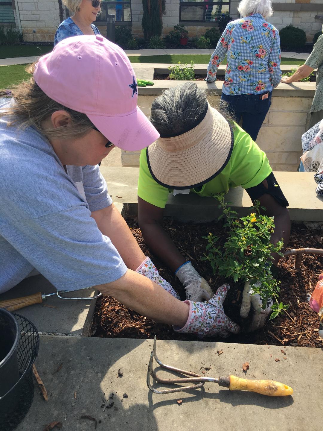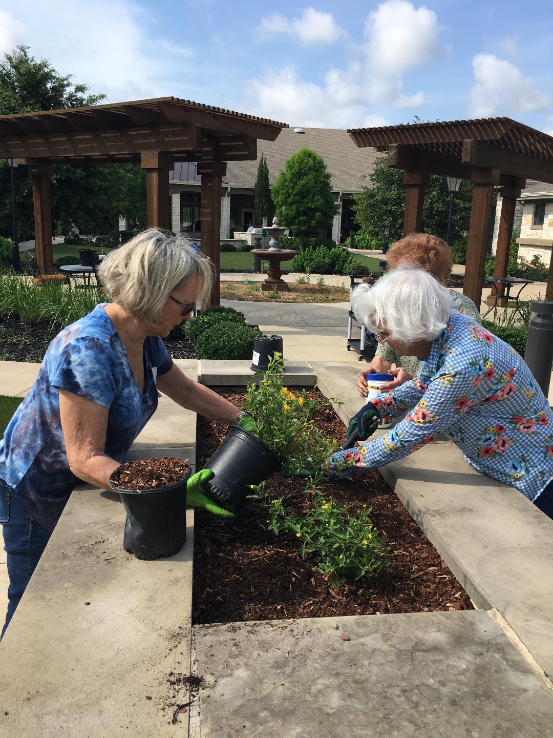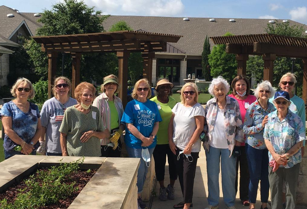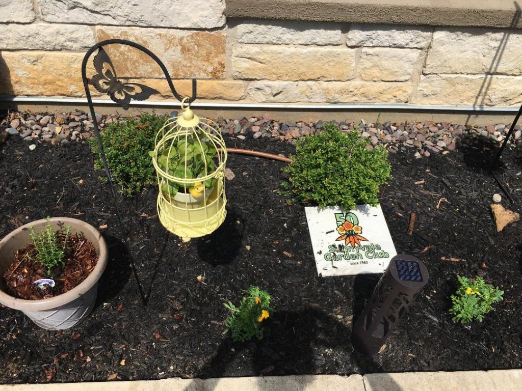 Nine Sunnyvale Garden Club members, one guest, three Long Creek residents and the Activity Director at Long Creek participated in a beautification project at Long Creek Assisted Living and Memory Care. Our club was awarded a $250 “Plant America” grant to plant an herb garden in the Memory Care courtyard to be used as Aromatherapy. We also beautified the main courtyard raised beds with Lantana and flowers grown from seed by the residents. The work was completed in June.