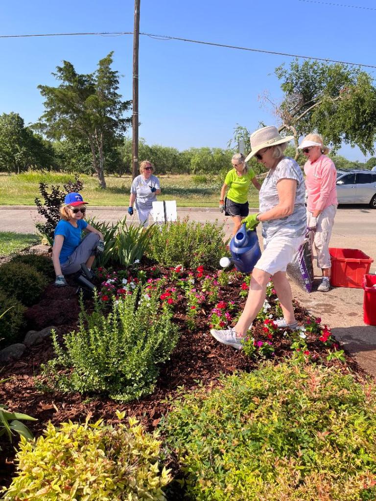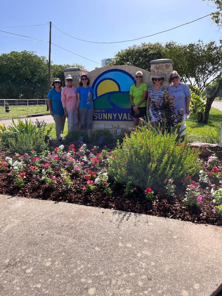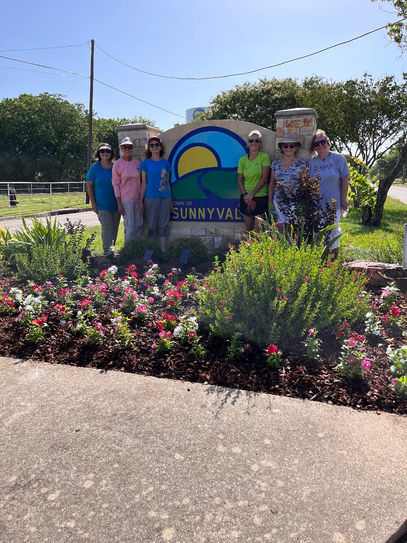 SGC members Mary Coon, Jonie Johnson, Donna Moore, Laurie Sparhawk, Cristie Carter-Stewart, and Nancy Keim planted, fertilized and mulched annual flowers in the main Town East Blvd. landscape bed, under the Sunnyvale monument sign. Also, trimmed and mulched other two beds in the median on Town East. They cleaned up, fertilized and mulched the landscape the landscape bed at the library and planted annual flowers in raised planters and urns at the library and fire station.