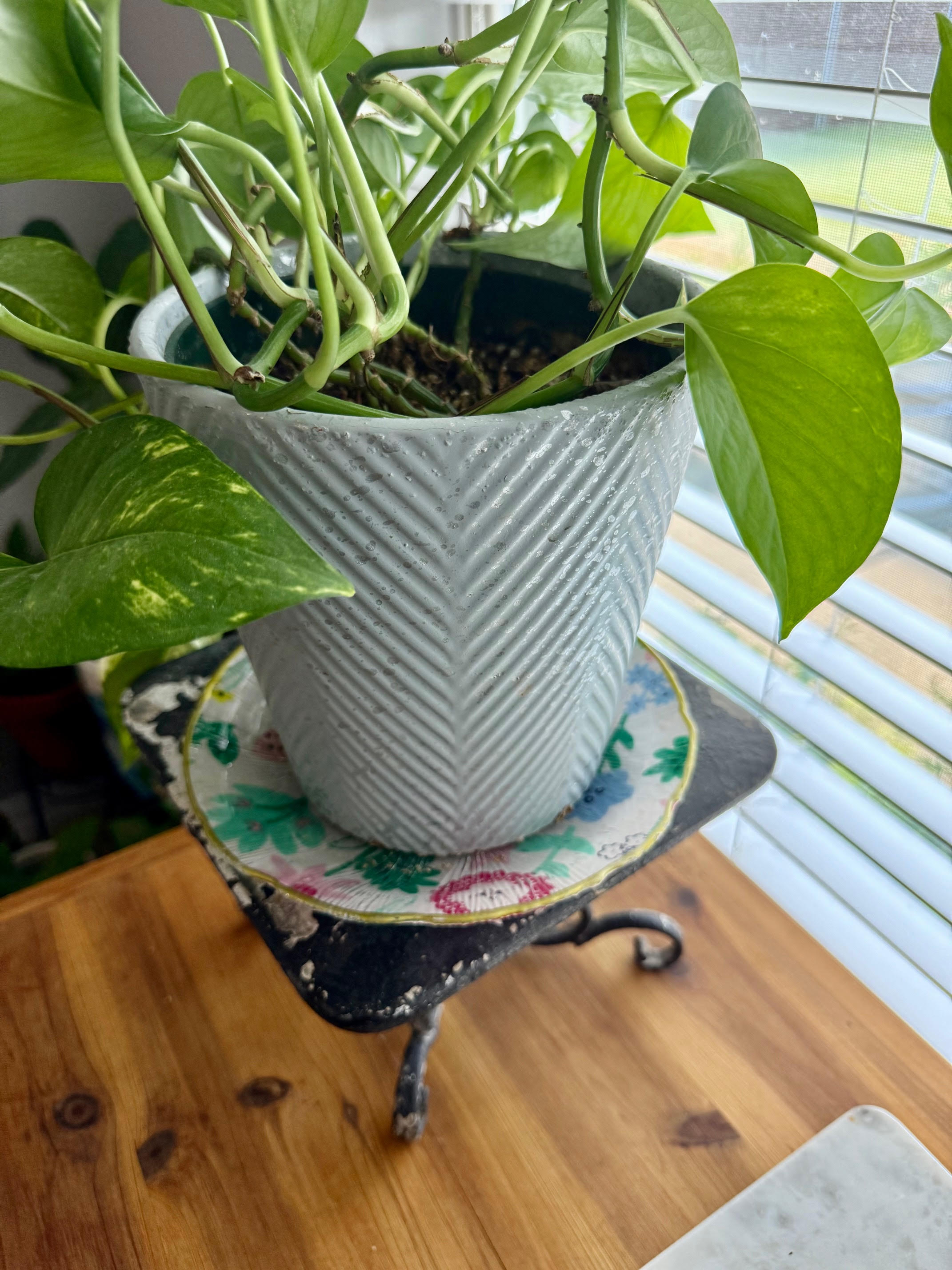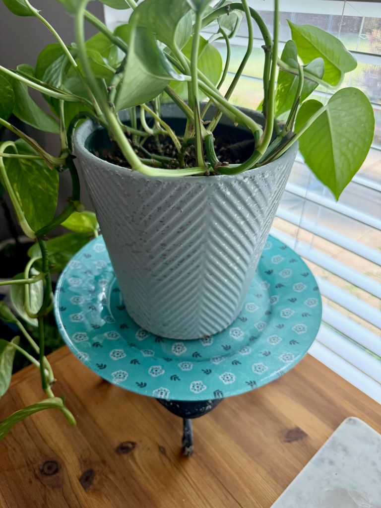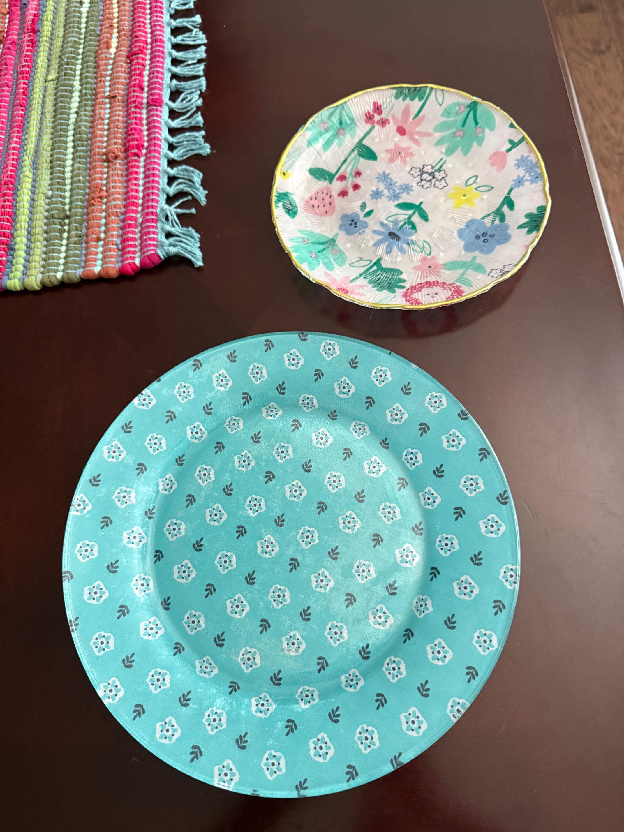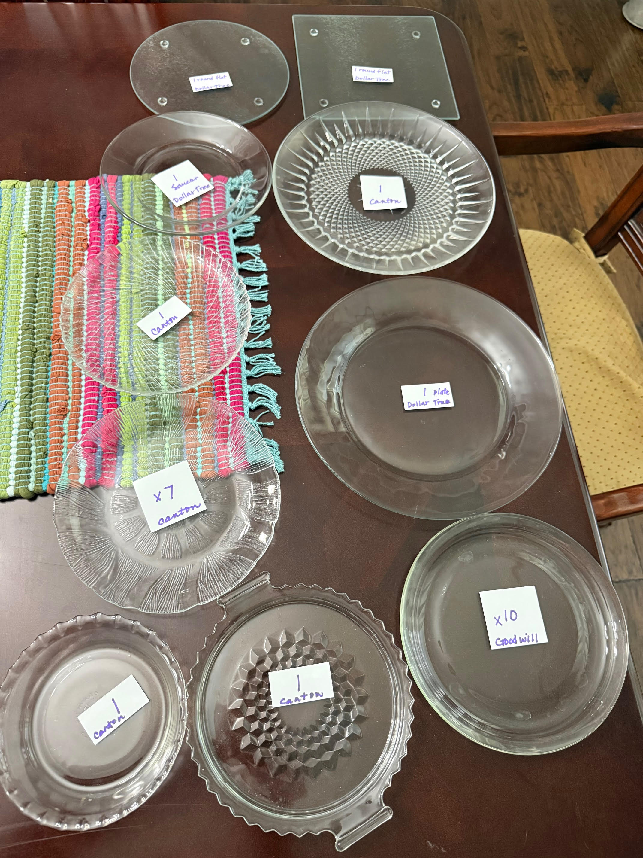 What to bring: We will be covering the bottom of glass saucers, plates with fabric. I have 24 saucer size glass plates-some with designs and some smooth (see pics). If you have an old clear glass plate or saucer or similar, bring it. Dollar Tree has the smooth clear saucers and plates for $1.25/1.50. I have a variety of fabric but if you have some scraps or want a certain pattern that will fit a saucer or plate size, bring your own. We will use Mod Podge to adhere the fabric and accent with a gold rim if desired. If you have any questions, please let me know. I am counting on the hot weather to dry these quick so there is no mess taking it home 🙂